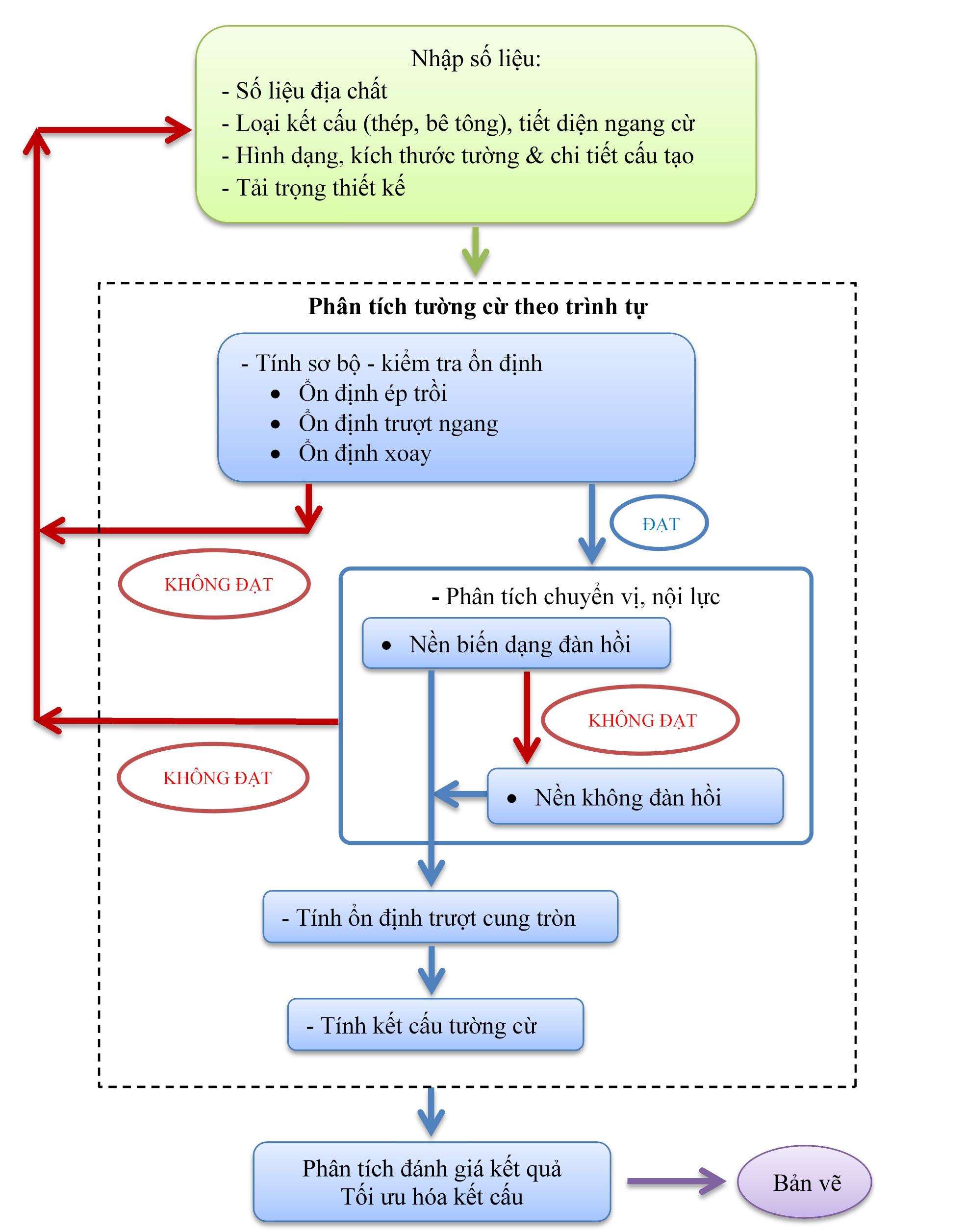 Áp dụng qui trình tính toán trên là bắt buộc nhằm bảo đảm đầy đủ các điều kiện về ổn định, biến dạng và khả năng chịu lực cho thiết kế kết cấu tường cừ. Quy trình trên giúp công tác thiết kế đầy đủ và nhanh chóng.